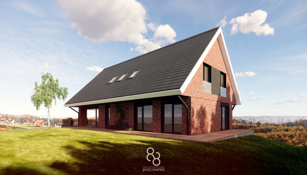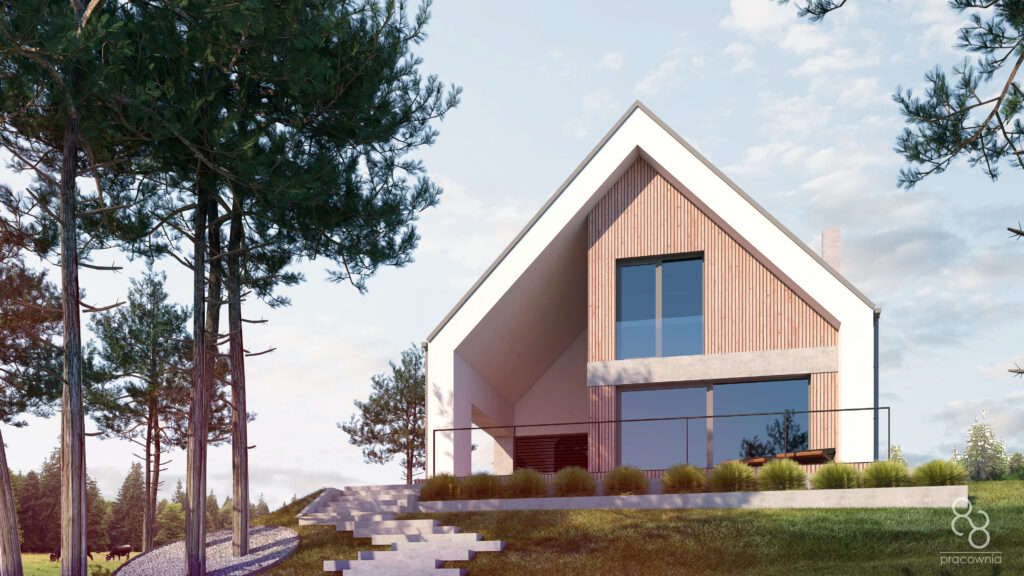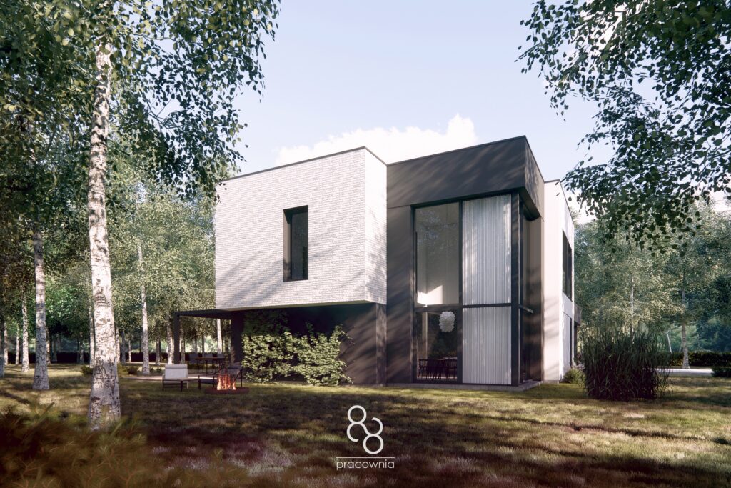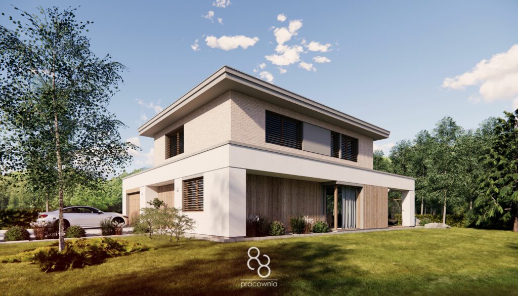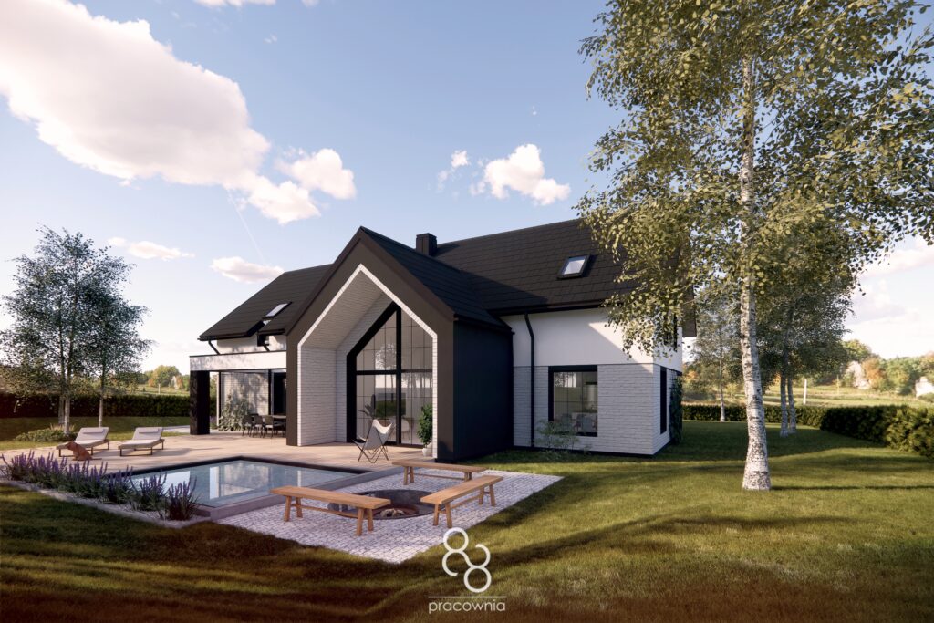 Prezentowany dom to przykład nowoczesnej architektury, która w sposób harmonijny łączy estetykę z funkcjonalnością. Jego prosta, geometryczna bryła skrywa przemyślane rozwiązania, które odpowiadają na potrzeby współczesnych użytkowników. Całość idealnie wpisuje się w otoczenie, tworząc komfortową i elegancką przestrzeń do życia.