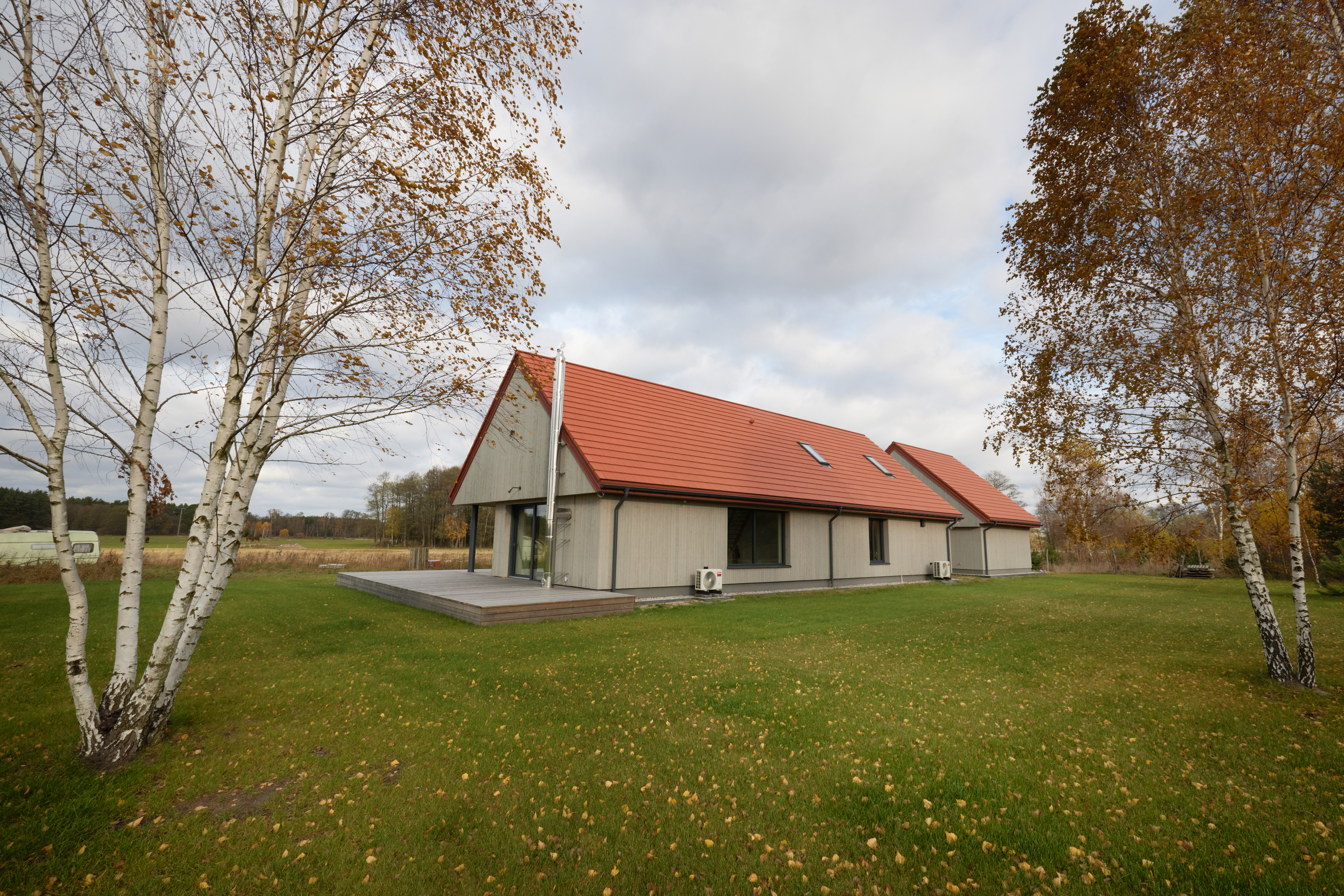 Ważnym elementem projektu jest szeroki, drewniany taras okalający część dzienną domu. Tworzy on naturalne przedłużenie wnętrz i pozwala na wygodne korzystanie z przestrzeni zewnętrznej, niezależnie od pory dnia. Minimalistyczne wykończenie, proste linie oraz starannie dobrane materiały sprawiają, że dom subtelnie wpisuje się w krajobraz, nie dominując nad nim, lecz podkreślając jego charakter.