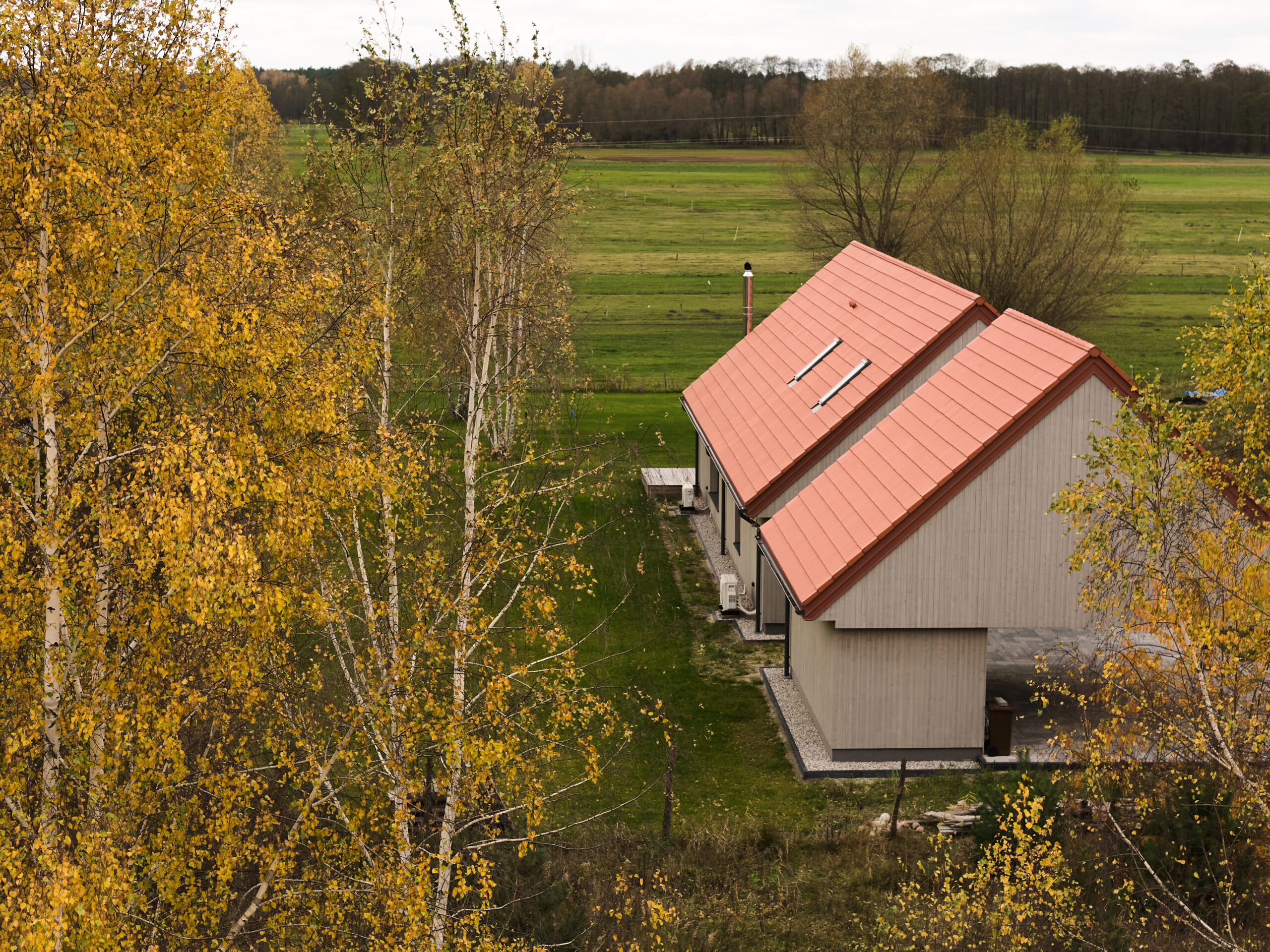 „Zagroda przy pastwisku” to realizacja domu jednorodzinnego, która harmonijnie łączy nowoczesną architekturę z wiejskim krajobrazem. Budynek, usytuowany na rozległej działce graniczącej z naturalnymi łąkami, czerpie pełnymi garściami z tradycyjnej zabudowy zagrodowej. Jego forma opiera się na dwóch prostych, zestawionych ze sobą bryłach z dwuspadowymi dachami, co nadaje całości lekkości i porządkuje przestrzeń.