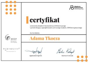Ukończyliśmy Akademię Budownictwa ZEROemisyjnego oraz posiadamy certyfikaty zaprojektowania pierwszego budynku zeroenergetycznego.