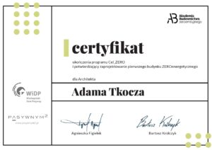 Ukończyliśmy Akademię Budownictwa ZEROemisyjnego oraz posiadamy certyfikaty zaprojektowania pierwszego budynku zeroenergetycznego.