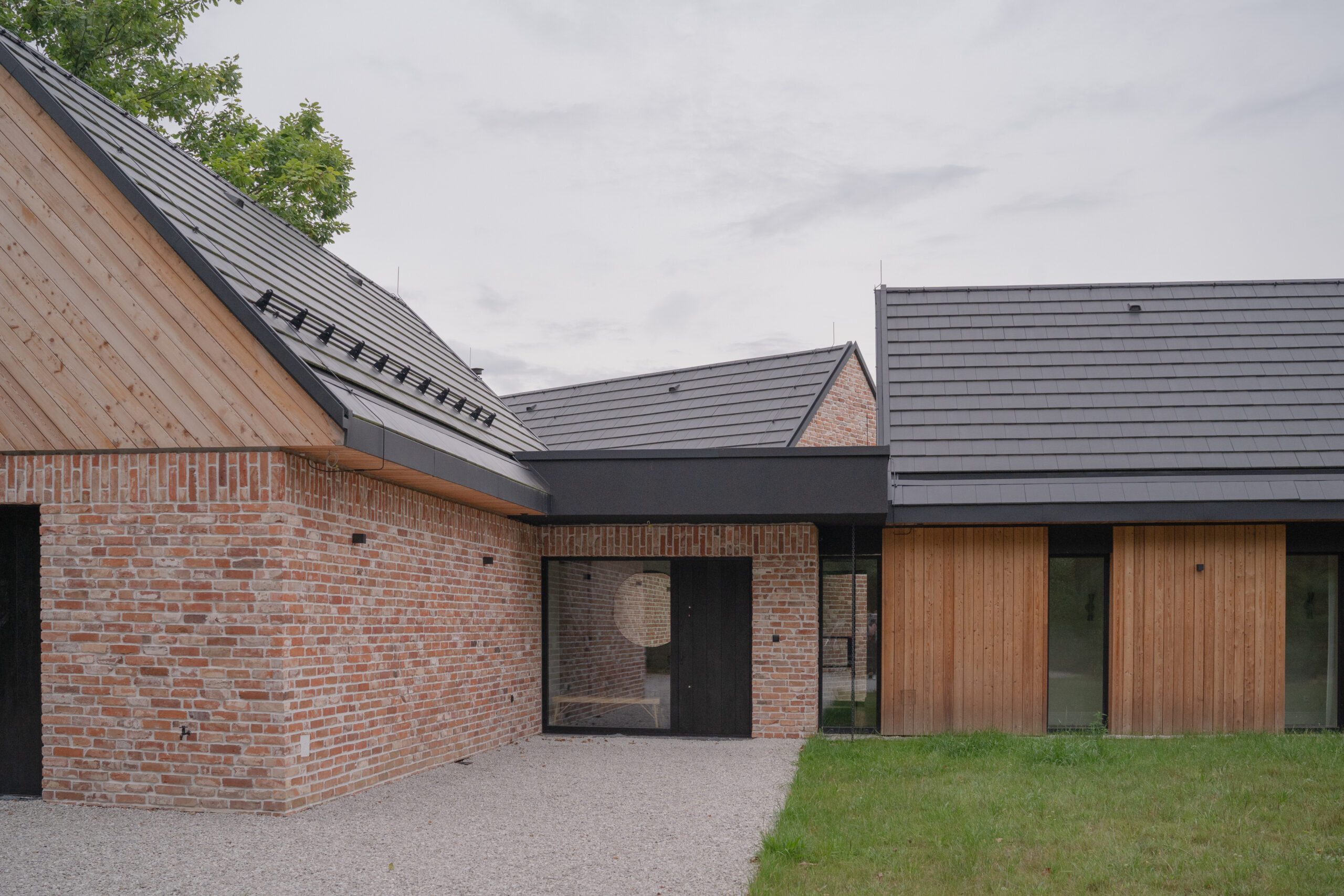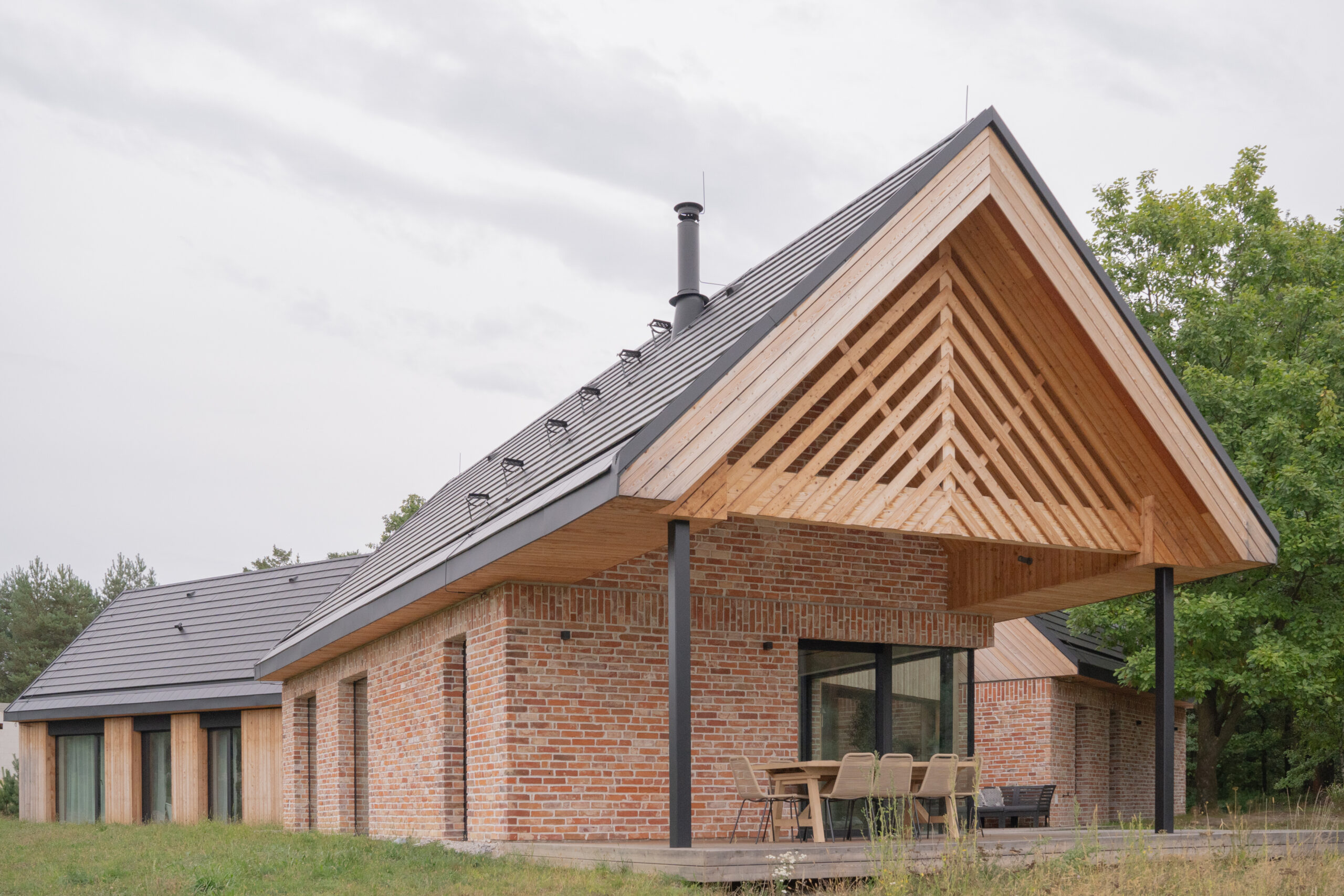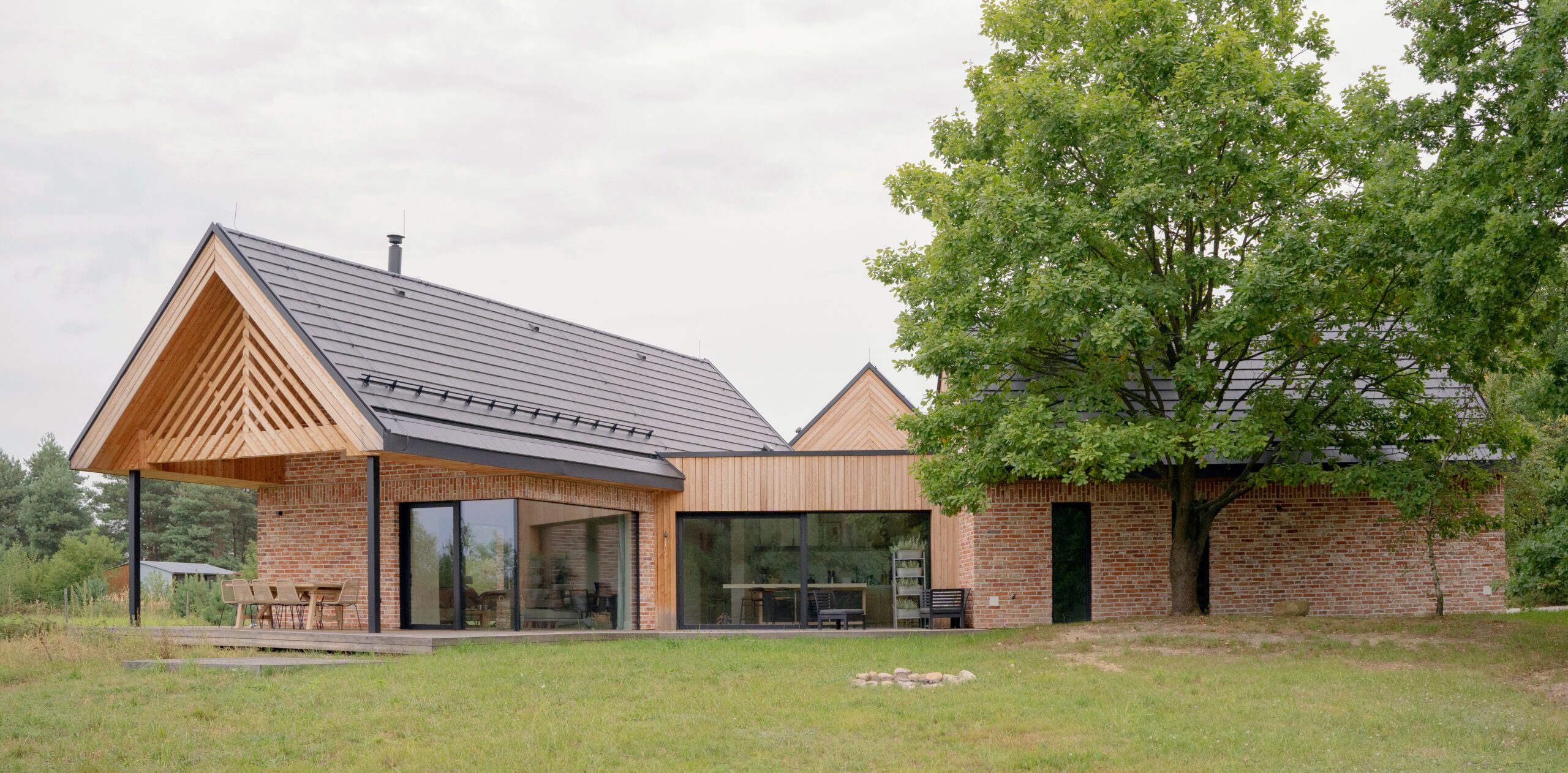 Elewacje z cegły z odzysku i drewna nadają domowi ponadczasowy wyraz, a duże przeszklenia otwierają go na naturę — światło, pory roku i las stają się tu współautorami przestrzeni.