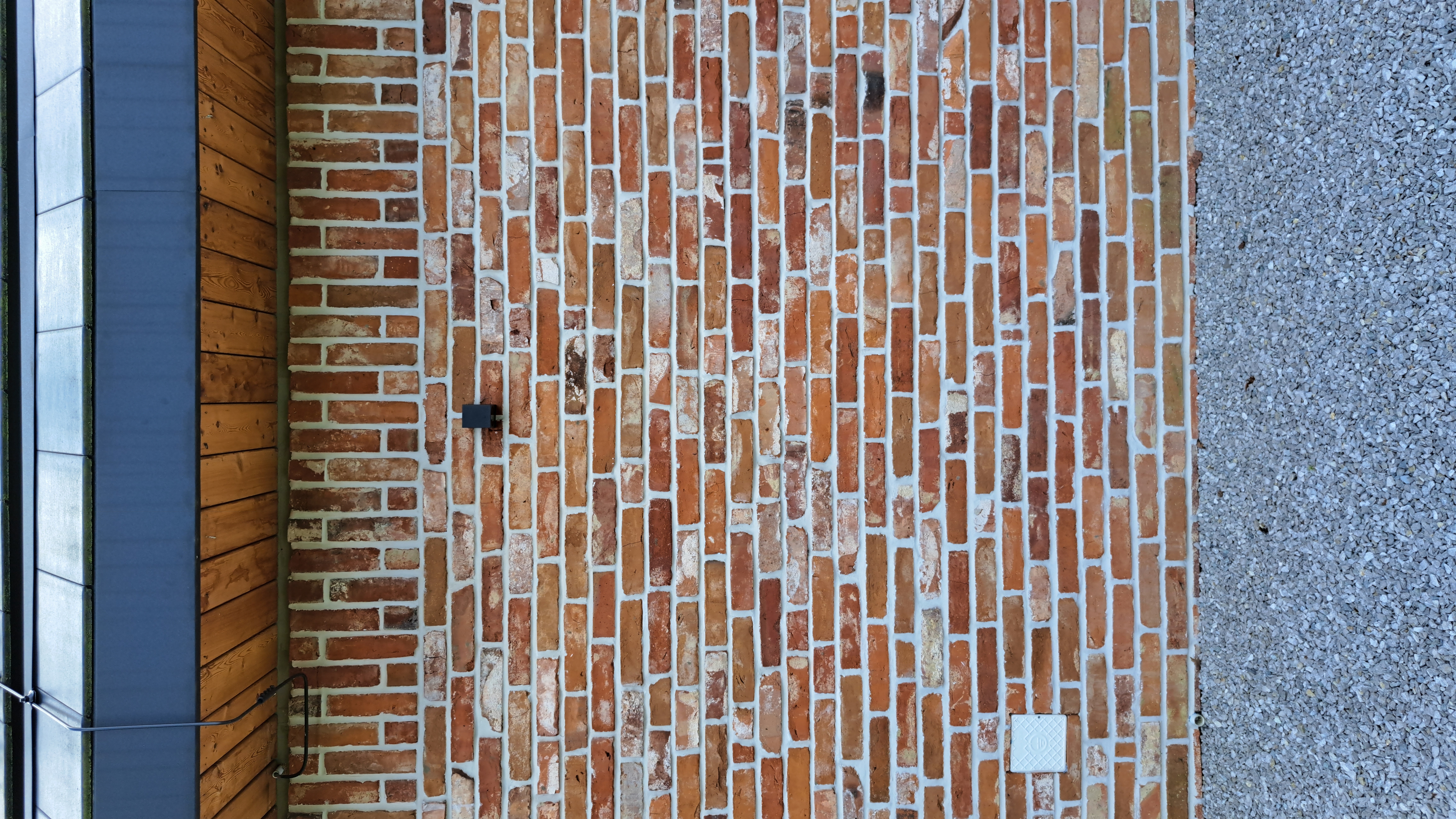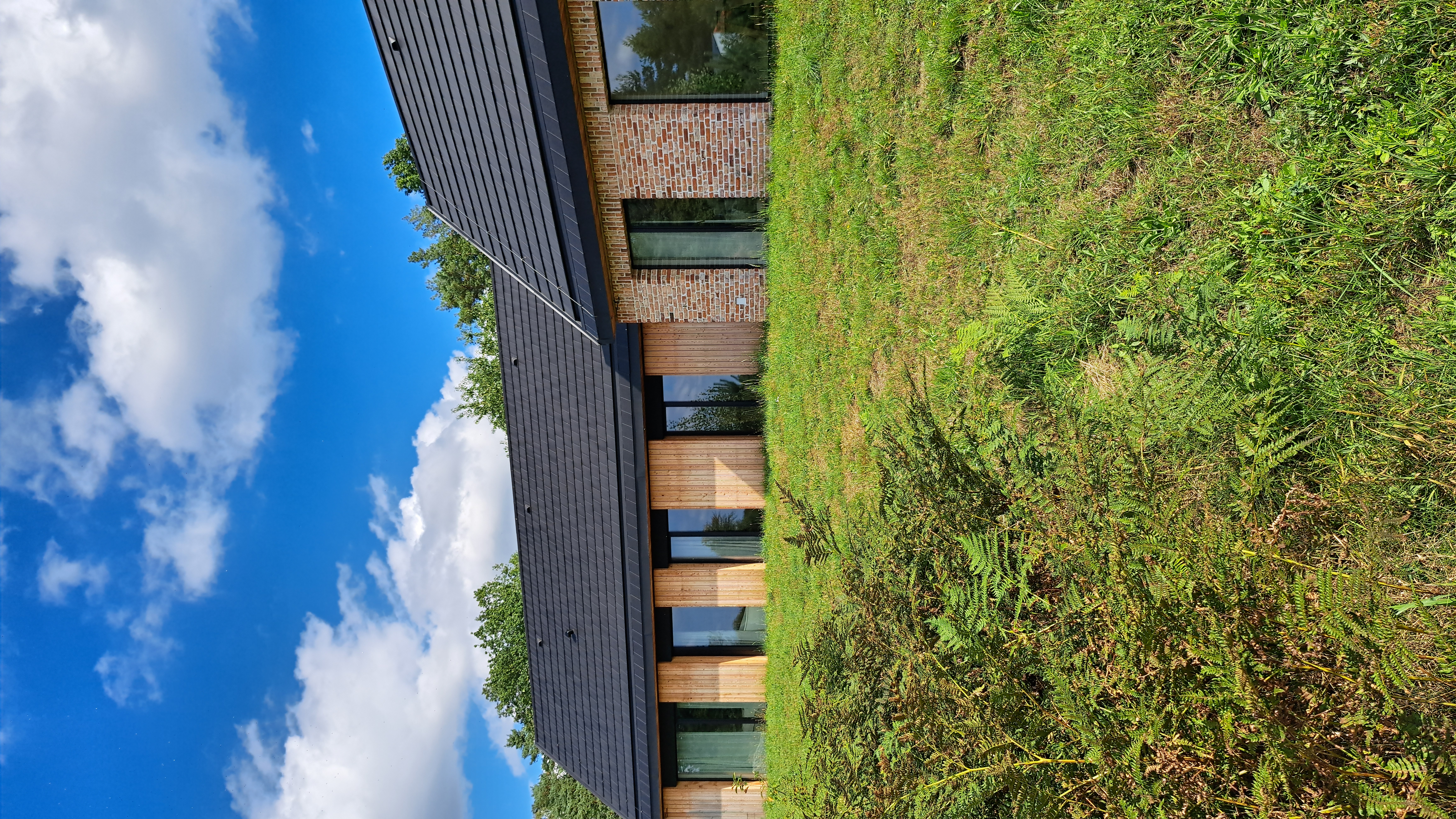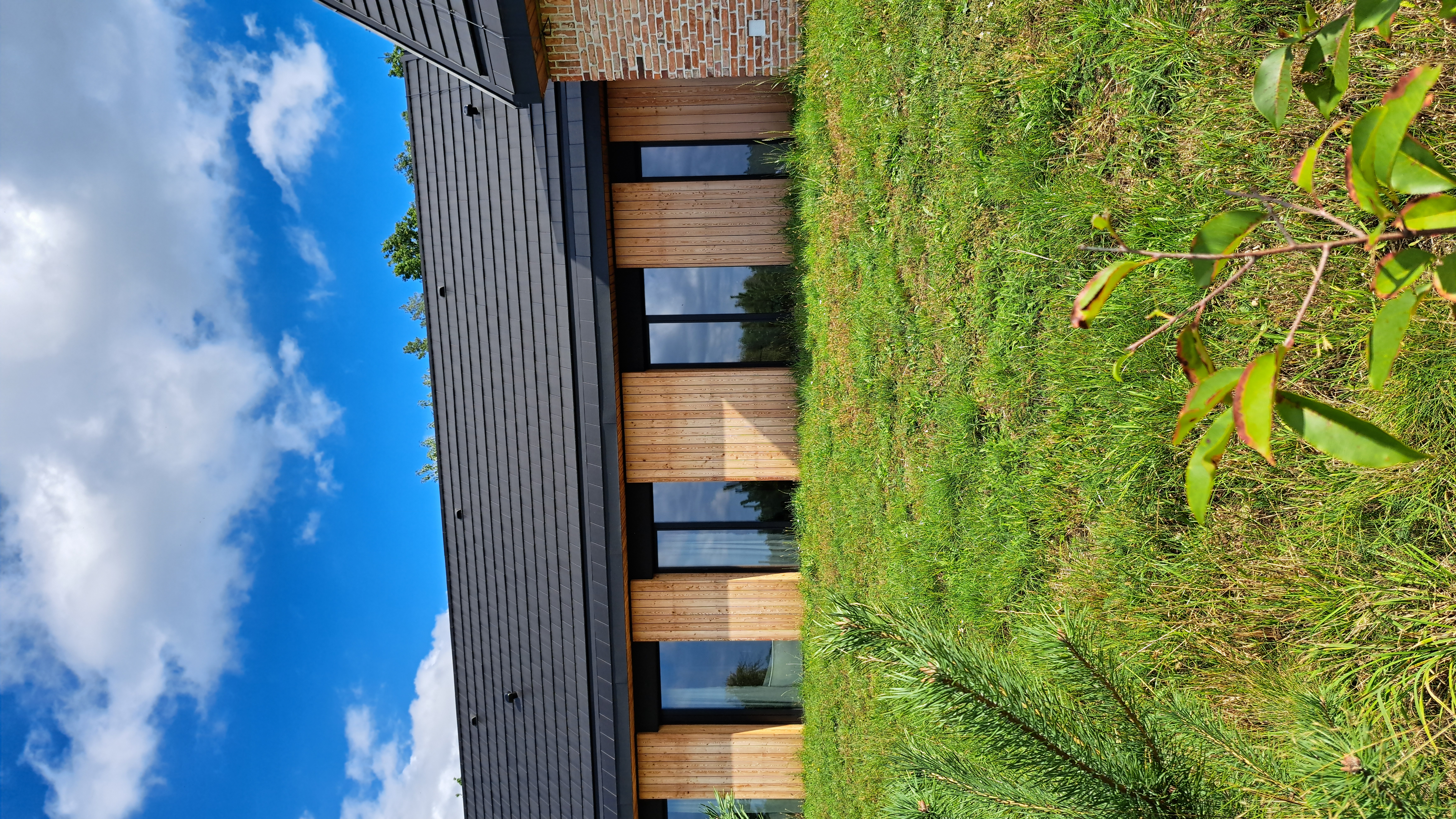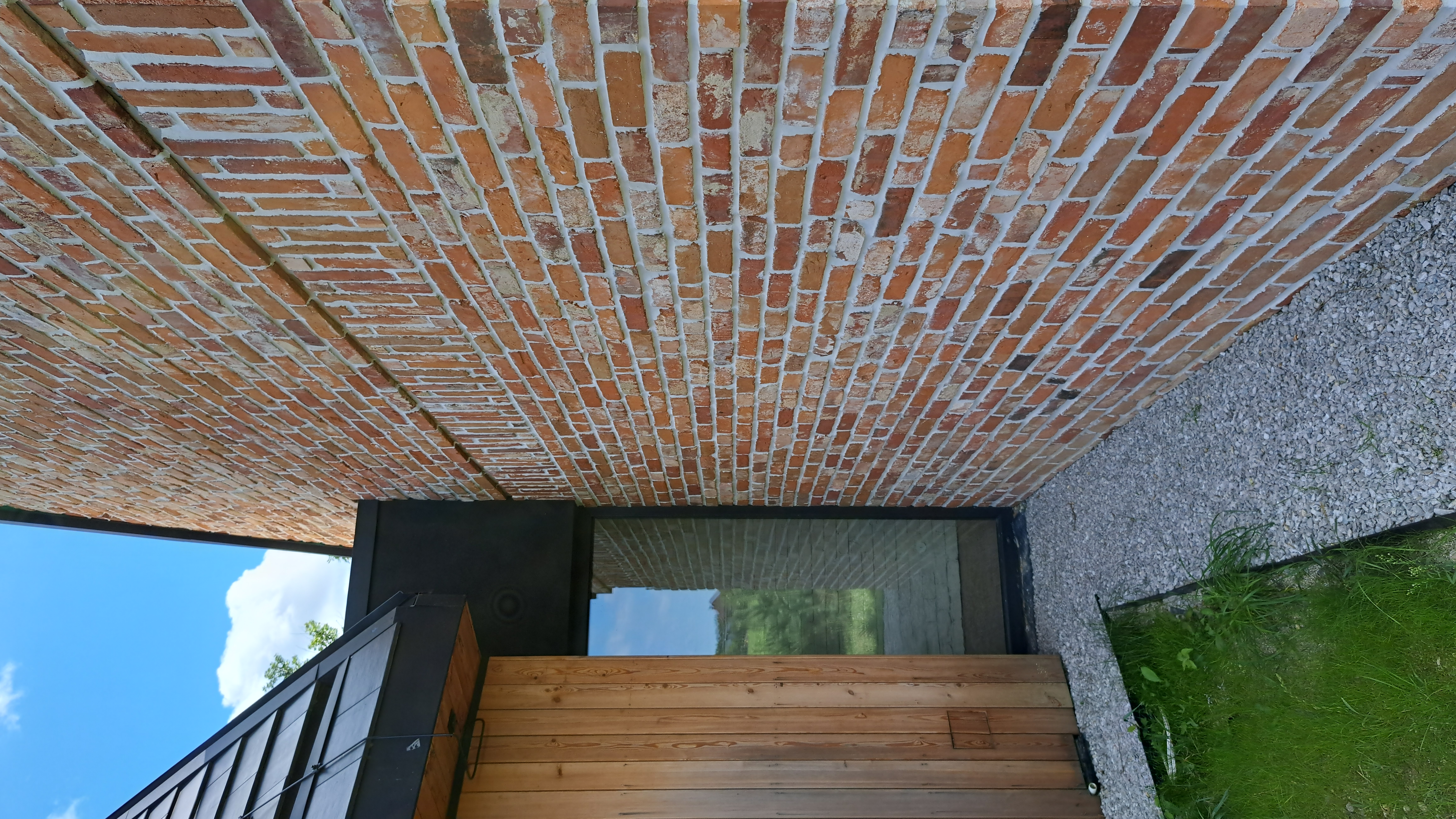 Elewacje z cegły z odzysku i drewna nadają domowi ponadczasowy wyraz, a duże przeszklenia otwierają go na naturę — światło, pory roku i las stają się tu współautorami przestrzeni.